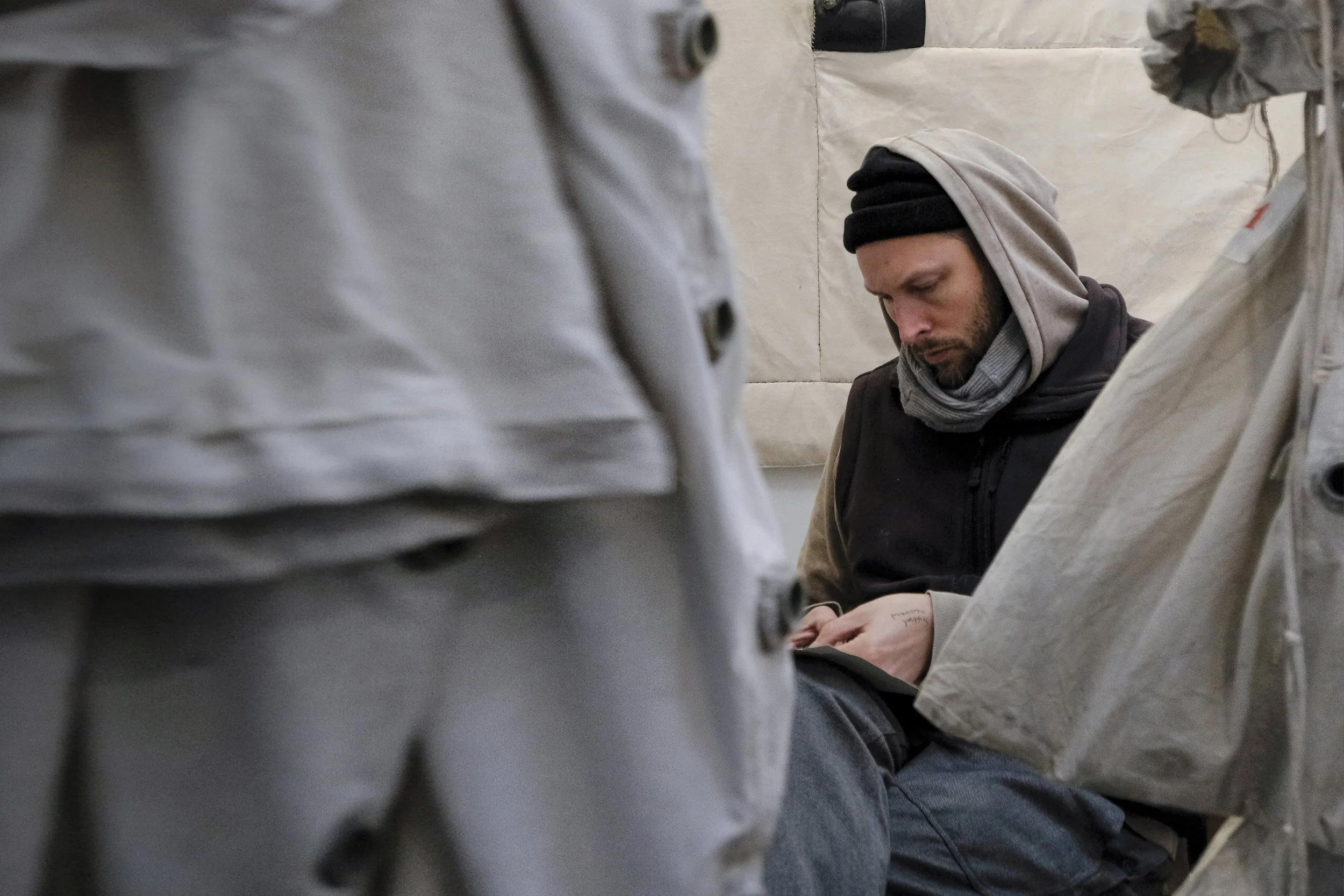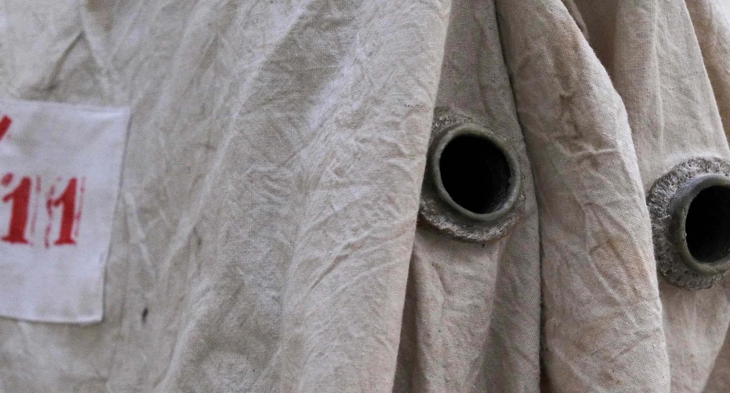 The Hermit assumes a soft quilted form within which a rubber pumping valve is placed – its body breached, implying a point of contact and of dependency. The Runner, borrowing industrial materials, yields to gravity and contact, its points of friction defining both its presence and its constraints. The Watchful hovers like a human head, a convex copper arch suspending fabric, leaving an emptiness at its centre that gestures toward vigilance and memory, a dream of lineage carried forward.