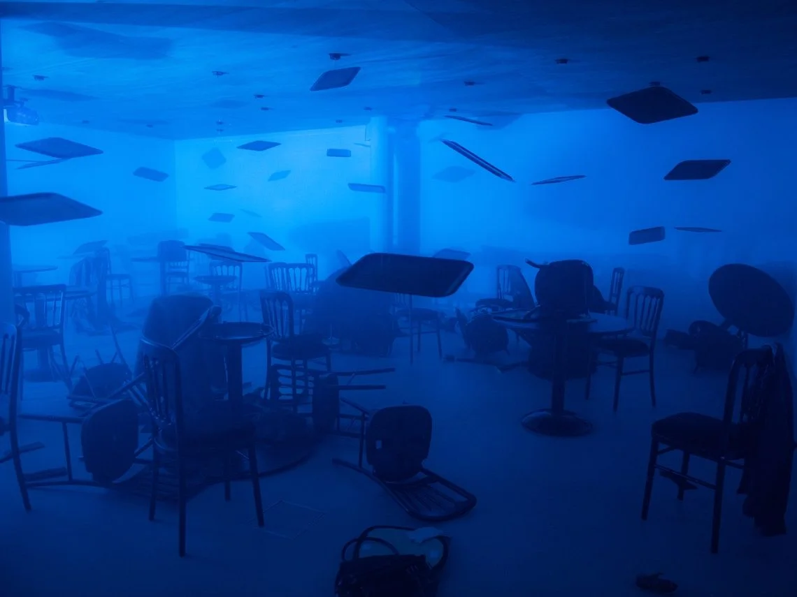 As a seven year old boy, Shaw had experienced such a moment of terror. Sitting at a café with his mother, he remembers being caught up in one of the twenty bomb blasts that rocked Belfast for eighty minutes on Bloody Friday, 1972. Decades later, Shaw referenced these boyhood memories in his immersive installation Mother, The Air Is Blue, The Air Is Dangerous. The wail of sirens rings out from loudspeakers. The floor is covered in overturned tables, chairs, old clothes and shoes. On the walls we can see the shadowy forms of slowly running people, whilst dinner trays spin through air filled with a blue haze. But like memories that become distilled and crystallised over time, this is no longer a specific representation of the centre of Belfast on a July afternoon but something more universal: it is an invitation to journey into the heart of terror, when the world slows down, everything becomes more intense, and we stand momentarily rooted to the spot.
